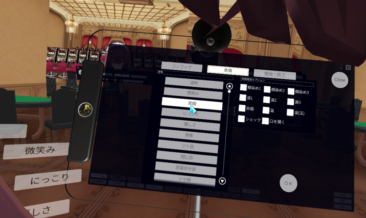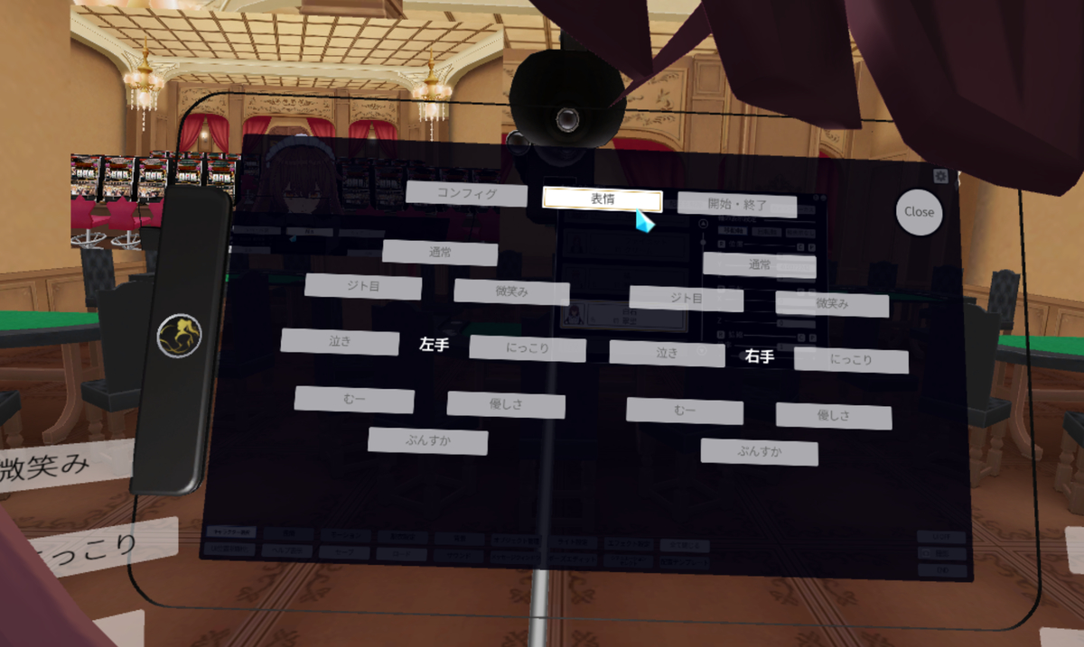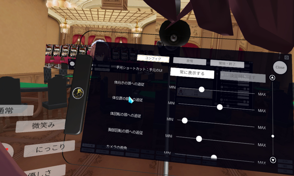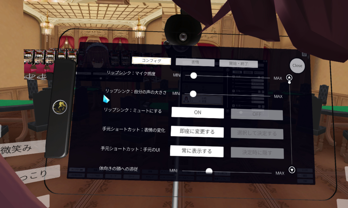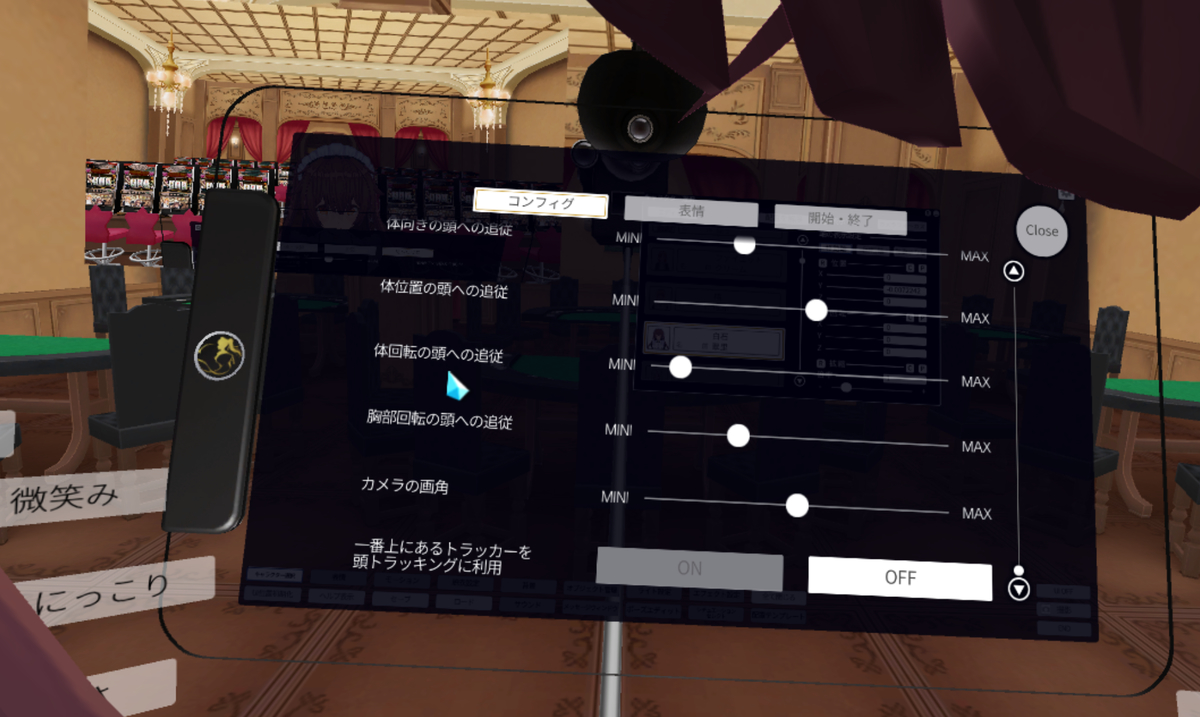 VAメニューの「コンフィグ」では、「カメラの画角」や「トラッカーをHMDの代わりに頭トラッキングに使う」「リップシンク用マイクの感度」やIKの詳しい設定が行えます。