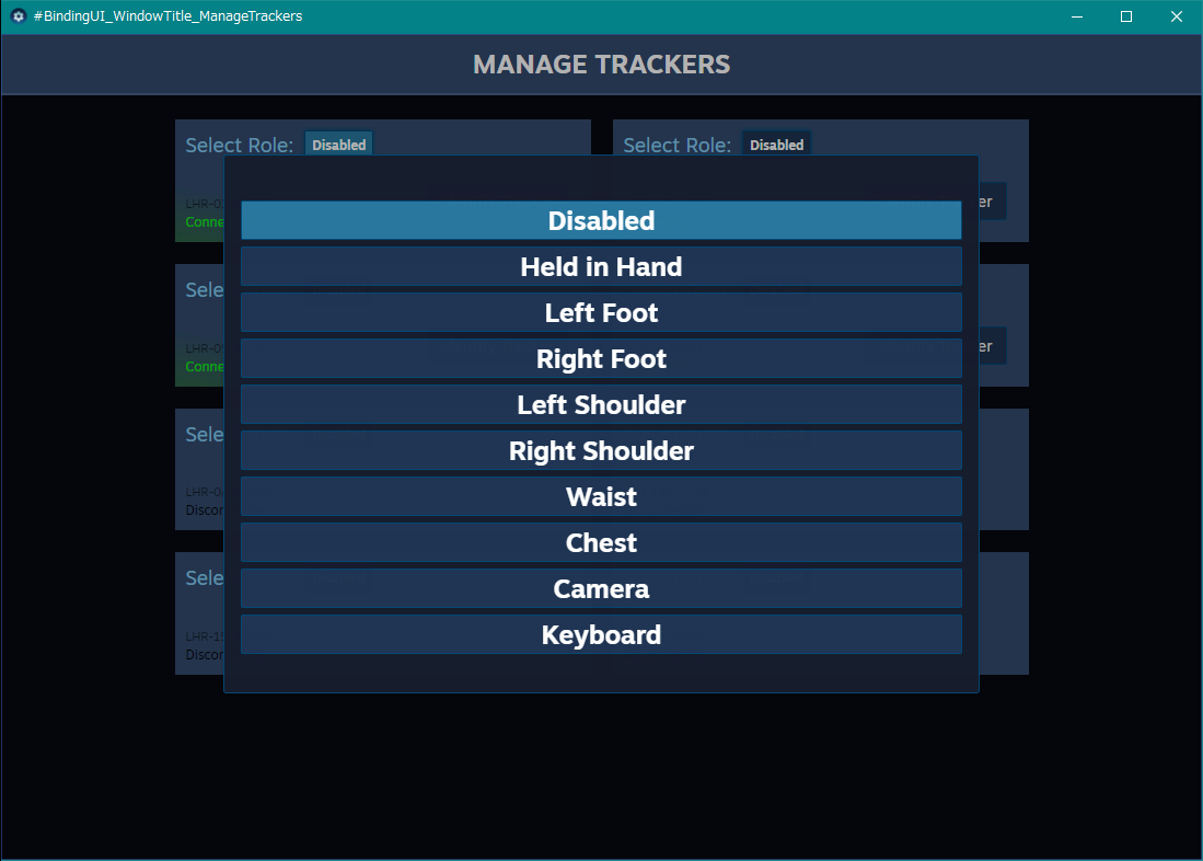 SteamVRのアップデートにより、トラッカーの役割を設定する機能が追加されたことによる問題です。トラッカーがコントローラとして認識されてしまう、もしくはその逆の問題が発生した場合は、ゲームの開始前にSteamVRの「デバイス」→「Manage Vive Trackers」から「Role」を「Disabled」に設定して下さい。(VR内のSteamVRダッシュボードのSettingsからもできます。)