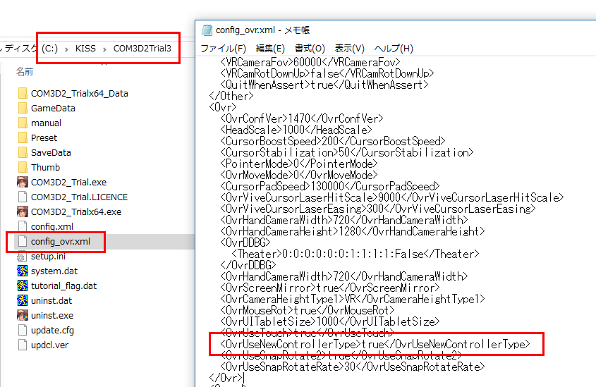 VRをプレイされている方で、昨日公開の Ver0.03 を既にインストールされている方は、インストールフォルダの「config_ovr.xml」をUTF-8対応のテキストエディタ等で開いて頂き、<OvrUseNewControllerType>の項目を「true」に変更して頂ければ、新UIタブレットモードの操作となります。
